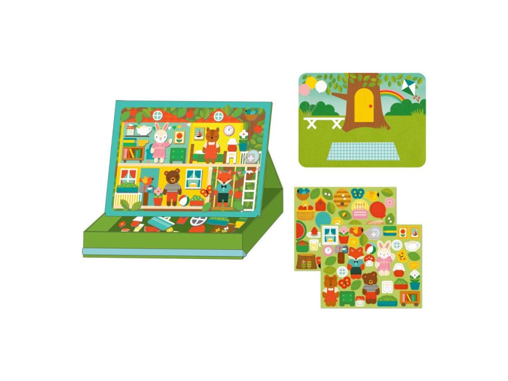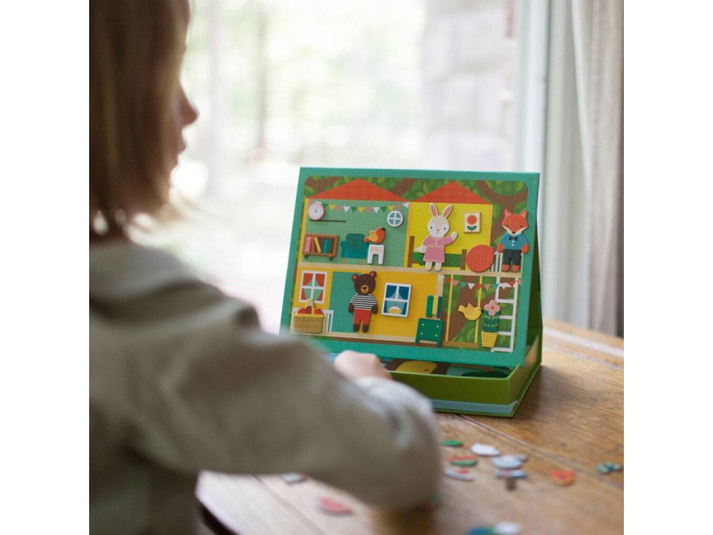 Magnetické divadlo zvířátkový dům je přenosná hračka, která dětem umožňuje rozvíjet představivost prostřednictvím tvorby vlastních příběhů. Tento set obsahuje dvě magnetické scény a více než 72 magnetických dílků.
