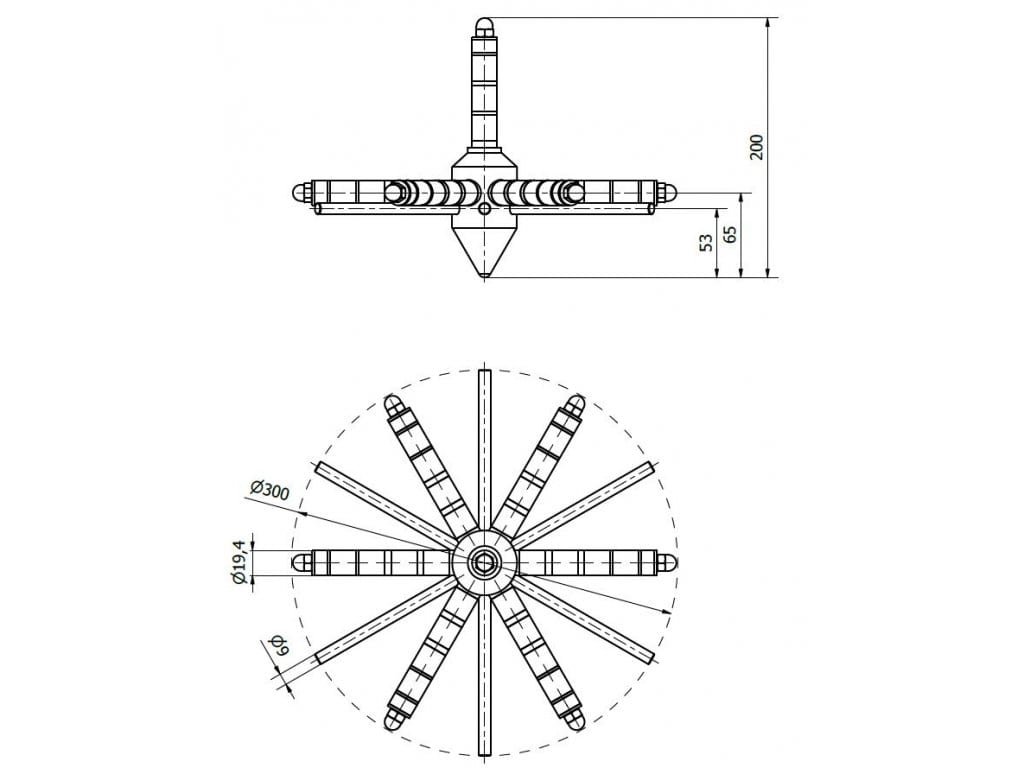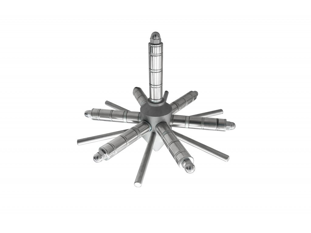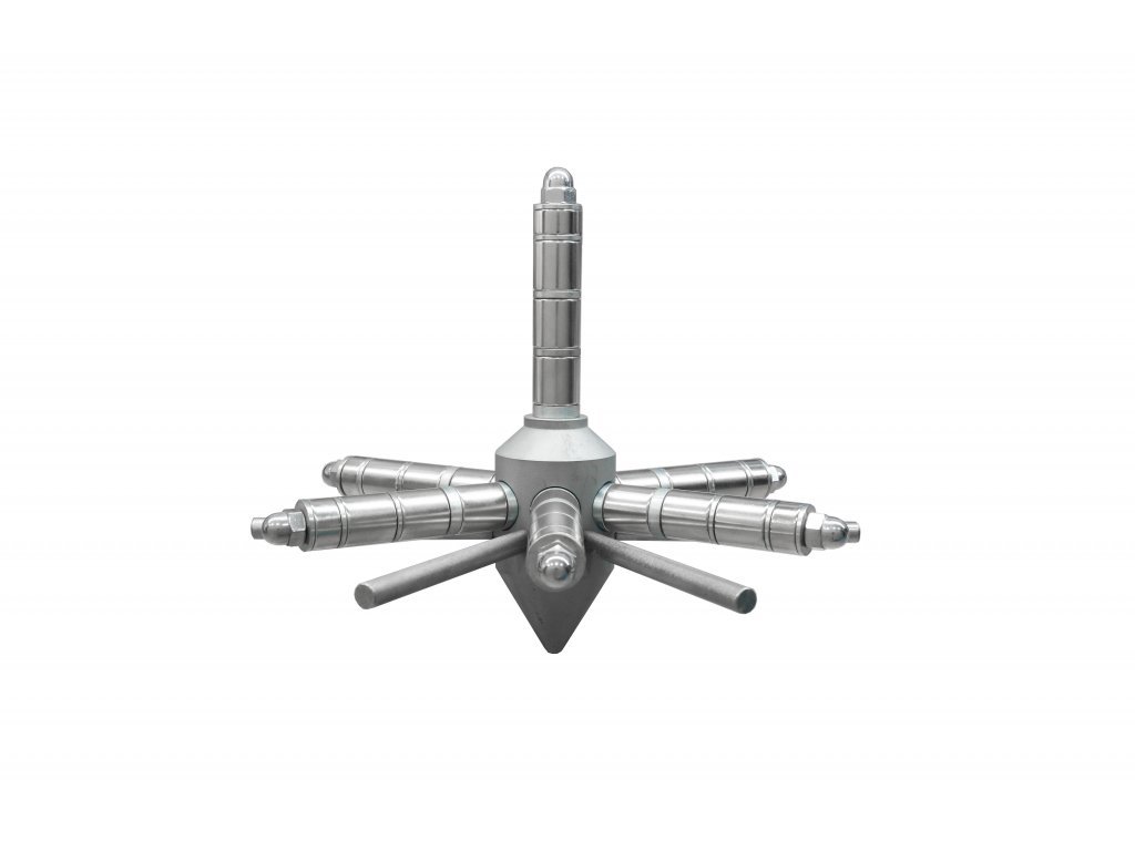 Při čištění se hvězdice vytáhne z násypky vstřikolisu a mechanicky nebo pomocí stlačeného vzduchu se odstraní zachycený feromagnetický materiál. Výhodami tohoto typu magnetického separátoru jsou velmi nízké pořizovací náklady, snadné použití, jednoduchá montáž a krátká dodací lhůta. Rozměry a celkové provedení hvězdice jsme schopni přizpůsobit potřebám.
