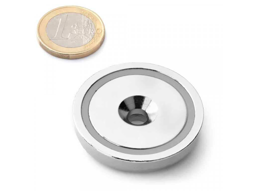 Neodymový poniklovaný magnet v kovovém poniklovaném pouzdře s prohlubní na šroub M6.