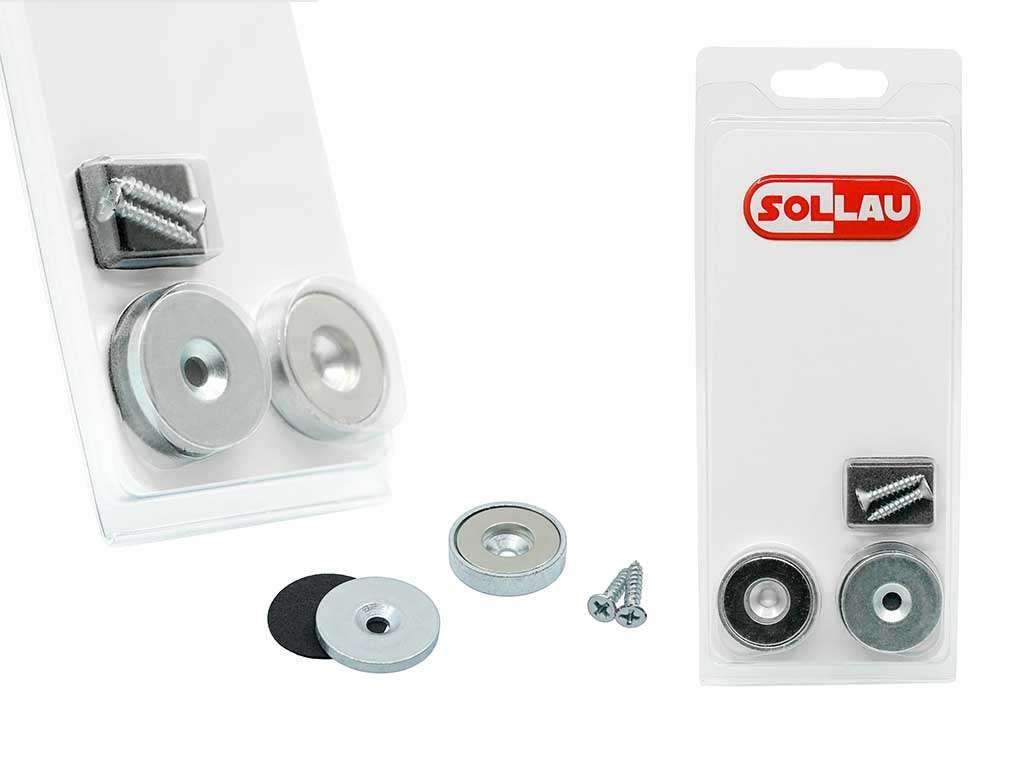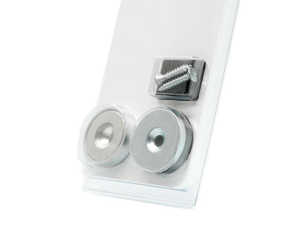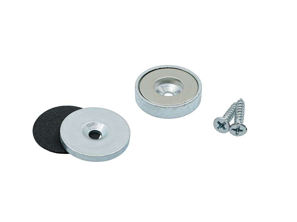 Vysoká přídržná síla je zajištěna díky použití velmi silného neodymového magnetu. Tento magnet je vsazen v ocelovém pouzdře, které magnet chrání před poškozením (prasknutím). Ocelové pouzdro zároveň zvyšuje sílu magnetu. V zadní části ocelového pouzdra je otvor, takže je pomocí přiloženého vrutu snadno připevníte na požadované místo. Součástí sady jsou i ocelové protikusy s dírou pro zápustný šroub, které snadno našroubujete nebo přilepíte k dvířkům skříně. Vruty jsou součástí balení.